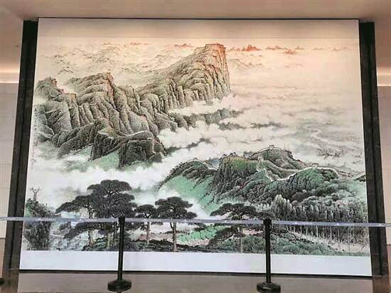 鸟瞰清晨的长城,初升的太阳照耀着崇山峻岭,映射出红色的阳光,白云弥漫,参天大树直耸云端,长城在大地万物之间蜿蜒延伸。画面中无论远处的群山还是近处的树木、梯田,都极尽写实之妙。