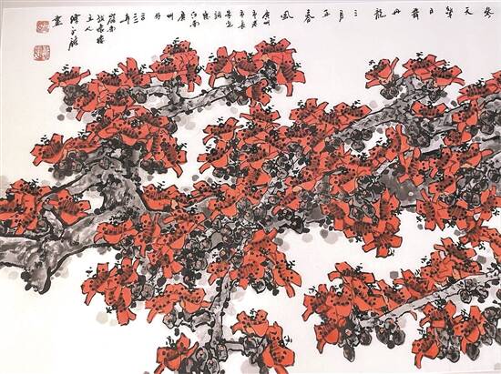 陈永锵创作木棉题材的作品,是在铺张而充实的饱满构图里,用霸悍强劲的笔墨将树枝树干以山的纹理加以描绘,因此创造出雕塑般的造型,能充分地把木棉的雄风和坚韧表现出来。巨大的画幅之中,木棉以浑茫雄浑之气,以排山倒海、气势憾人的宏大构思,让人领略“大写的自然”的震撼、“信笔直写”的气度,以及充沛的生命意识。