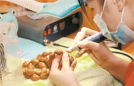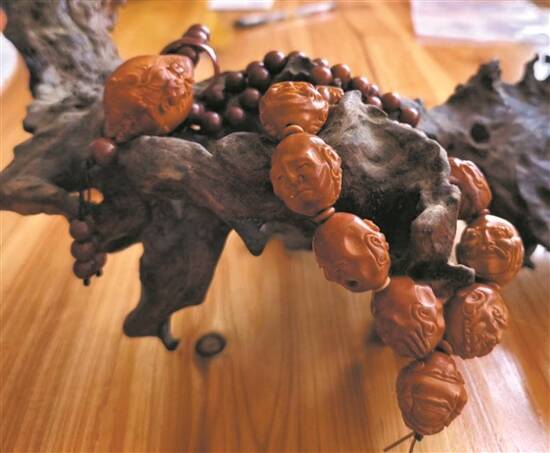 梁伟杰说,数控雕刻只是第一步,接下来还要经过人工修饰、打磨抛光、打孔、串珠等工序,才能成为挂件、手串、项链等工艺品。“当前产品主要面对文玩市场,出产的产品价格从几十元普通旅游纪念品到上万元的工艺精品皆有。”梁伟杰表示,产品的区分度取决于榄核的大小、质量和雕刻工艺水平等。