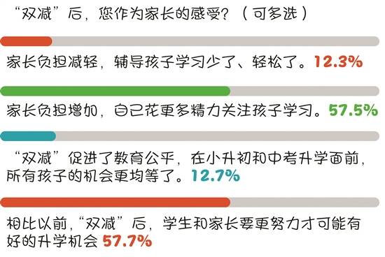 不过,觉得自己负担减轻、辅导孩子学习少了、轻松了的家长,仅占12.3%。被调查的57.5%的家长表示,“双减”过后,自己要花更多精力关注孩子的学习和成长。57.7%的家长认为,“双减”后,学生和家长要更努力才可能有更好的升学机会。