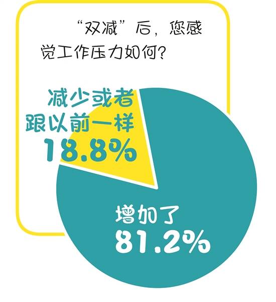 此次对老师的调查显示,81.2%的老师感受到工作压力增大了,63.2%的老师在备课时间上明显增多。对于课后托管,75.8%的老师希望学校引入第三方机构,让老师少干一些,69.1%的老师希望能够增加相关补贴。