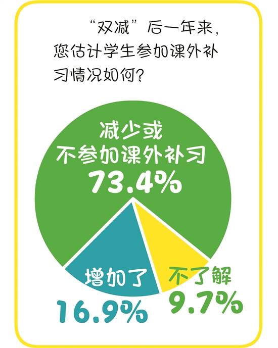 86%的老师承认所教的科目布置的作业量减少。59.2%的家长表示自家孩子没有参加课外补习,较之“双减”前,课外补习费用大大削减。
