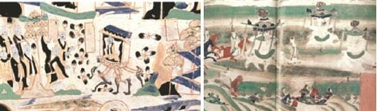 左图为莫高窟第296号窟窟顶南坡的壁画,年代为北周时期;右图为第61号窟南壁壁画,年代为五代时期。两幅壁画均展现了“以象载舆”的场景