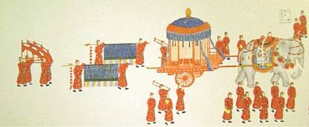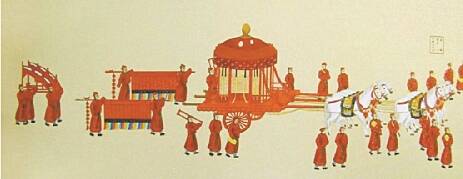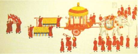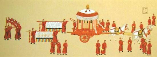 其中,玉辂是因其辇顶镶嵌以圆形玉版顶制作而得名;金辂则因其辇顶镶嵌以圆形金版顶得名;象辂因其辇顶镶嵌以圆形象牙版顶得名;木辂因其辇顶有黄花梨木的圆版顶而得名;革辂因其辇顶覆之以革为顶而得名。