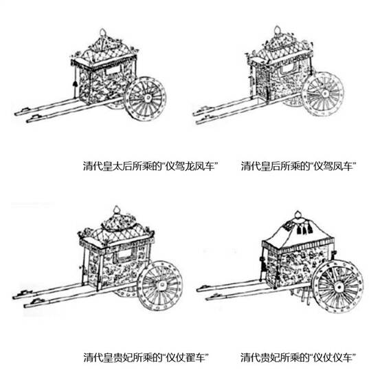你可能在某剧中曾听过某姑姑说:“紫禁城只有三位正经主子,皇上、太后和皇后。”话虽是这么说的,但真正比较一下,你会发现太后和皇后的交通工具比起皇帝来说,差距还是蛮大的。清代早期的皇后、皇太后所乘还被称为“舆”,但乾隆十四年(1749年)时却全部改名为车,皇后以下的妃嫔也都是如此。另外,后妃的车也没有皇帝所用“辂”中的大象,只能用马。马的数量还有严格控制,只能用1匹。