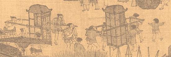 到了宋代,这种封闭性的设计更一发不可收拾。这种代步工具被俗称为“轿”,有顶盖,有闭合的轿厢,还开一轿门,两侧还有小窗。从北宋大画家张择端名作《清明上河图》中,我们能发现这种封闭式的所谓“轿子”的代步工具,其形制显然已经发展成熟。这种交通工具既可以依靠人力,又可以依靠畜力。它风靡后世,上到皇室贵族(如上述清帝五辇),下到民间(如大众百姓常用的成亲的花轿)。
