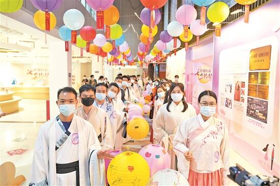 做灯笼、蹴鞠、过鹊桥……当晚,单身青年仿佛“穿越时空”,体验了一场别样的交友活动。他们穿着汉服,在传统趣味游戏中拉近彼此的距离,共同观赏了广州青宫橱窗剧场的特别演出。《但愿人长久》《青花瓷》《伯虎说》《花好月圆夜》……娓娓动听的歌声,营造了优美动人的节日气氛。