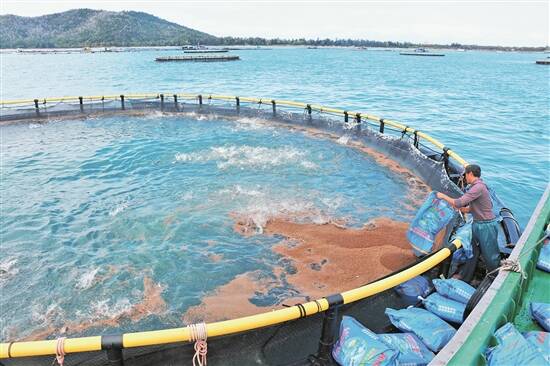从遂溪草潭镇草潭码头乘坐快艇,大约30分钟便可到达湛江汇富海洋科技有限公司的养殖基地。几个渔民从大船上卸下几袋饲料装到小船上,开往不远处的深海网箱。饲料甫一倒入,平静的网箱里,鱼儿欢欣雀跃起来。