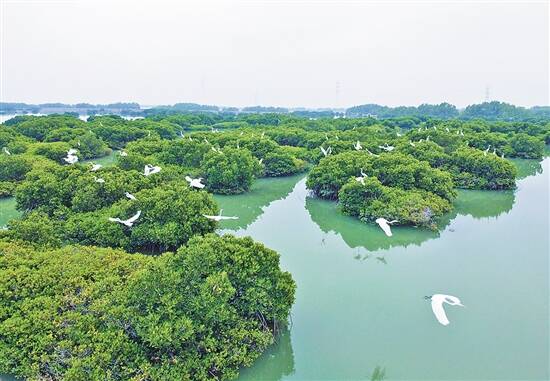 站在保护区栈道上,既能看到连绵的绿色长廊,又能看到鹭鸟林中飞,绵延的红树林构成一幅秀丽画卷,让人顿生世外桃源之感。