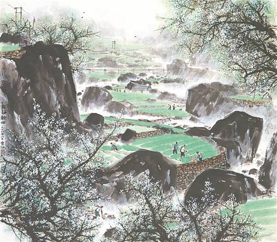 在林丰俗的山水画中,“自然与田园”是其关切并贯穿始终的母题。《石谷新田》没有将焦点直接放在农民热火朝天劳作的特写或近距描绘上,而是全景式地鸟瞰袅袅烟云、电线桥梁、苍翠农田与点点农民身影,通过自然环境与现代化建设相结合的方式,展现新农村的全貌。