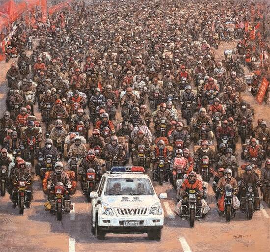 上世纪90年代以来,随着城镇化的步伐不断加快,大批农民开始奔向城市,成为“城市里的异乡人”。无论是对城市文明的彰显和趋同,还是对乡土文明的执着与坚守,艺术家们以此为素材的创作留下了深深的时代烙印。努力拼搏的身影和“人在他乡”的生存现状,成为艺术家们关注和描绘的对象。王永的《打工潮》描绘了上世纪90年代的广州火车站,春运期间农民工们拿着大包小包的行李候车回家的热闹场景。
