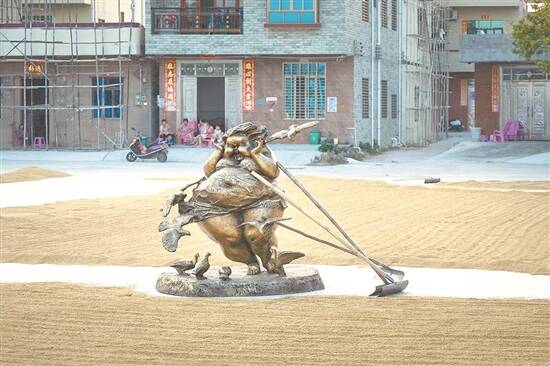 从2020年起,许鸿飞开启“雕塑艺术百村展”系列,以艺术助力乡村振兴,取得了良好的社会反响。每逢新展,许鸿飞都有新的作品产生。他会根据每个展出场景和空间的不同来创作,让作品与环境之间产生互动。在阳西展览现场揭幕的作品《丰年》,就是许鸿飞不久前到阳西县考察时有感而发创作的:三个肥女象征勤劳而富有阳光气息的阳西人,她们收割稻子时夸张的肢体语言表现出丰收的喜悦,充满了快乐的力量,反映新时代的乡村振兴和农民的精神风貌。