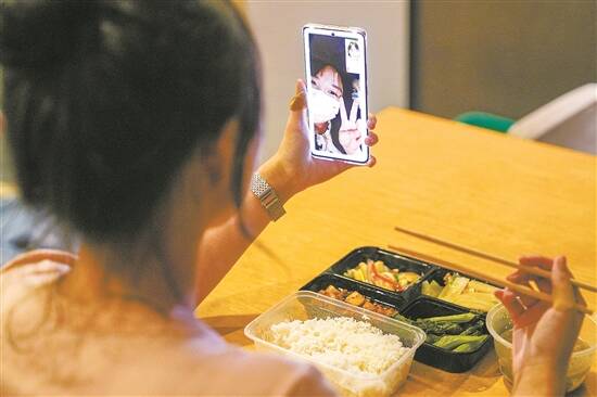 刘卓岚和亲友进行视频通话,分享在南沙的工作和生活