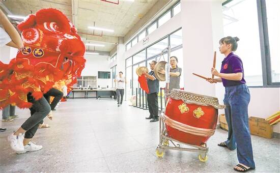 刘卓岚(右一)跟实习生伙伴排练舞狮,她负责打鼓,实习期间,她将在公司九周年庆上表演
