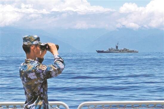 5日,中国人民解放军东部战区海军继续在台岛周边海域展开实战化训练。这是某舰官兵在瞭望观察 新华社 发