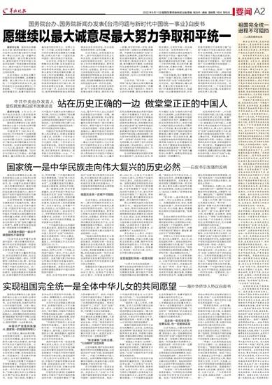 国务院台湾事务办公室、国务院新闻办公室10日发表《台湾问题与新时代中国统一事业》白皮书。白皮书的发表,在海外华侨华人中引发强烈反响。大家一致认为,白皮书展现中国共产党和中国人民追求祖国统一的坚定意志和坚强决心,深刻揭批民进党当局加紧“倚美谋独”和外部干涉势力试图“以台制华”的恶劣行径。大家表示,坚信中国统一大业前景光明。