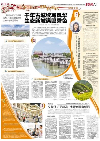 千年古城面貌焕然一新,海陆交通网徐徐织就,产业质效稳步提升,“一轴两带”区域发展格局逐步形成……党的十八大以来,潮州努力强化“一大引领”、打好“三大战役”、推进“六大提升”,至2021年年底,地区生产总值突破千亿大关,人均生产总值达4.9万元。当前,潮州持续激发发展活力、增强竞争力,在更高起点上打造沿海经济带上的特色精品城市。