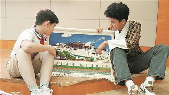 林芝的次旺札西同学向惠州少先队员介绍自己带来的礼物——布达拉宫手工挂毯 通讯员供图