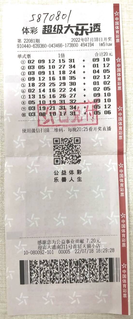 7月18日,体彩大乐透第22081期开奖,前区开出号码“05、10、19、31、32”,后区开出号码“09、10”,广东省喜中一等奖9注。令人欣喜的是,其中1注出自茂名信宜市东镇街道迎宾大道南311号首层的4410080092体彩实体店。