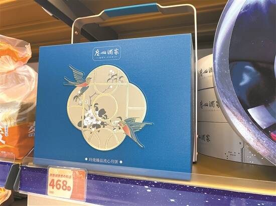 位于天河区棠石路的利口福蛋糕店专营广州酒家月饼,价格从100多元到400多元不等。记者在店内发现,其最贵的一款玲珑臻品流心月饼价格高达468元,产品包装精致,配有金属提手。另一款广州酒家与中国航天太空创想文创联名推出的“天宫寻梦”月饼礼盒,售价为338元,其外包装使用硬纸壳加透明塑料薄膜,盛放月饼的内包装则是金属材料制作的两枚“火箭”。