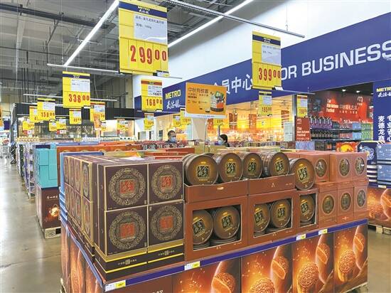 天河区黄埔大道中的麦德龙超市内,所售月饼琳琅满目,囊括各大知名品牌,其中既有8元一个的散装月饼,也有价格高达400多元一盒的精品月饼。