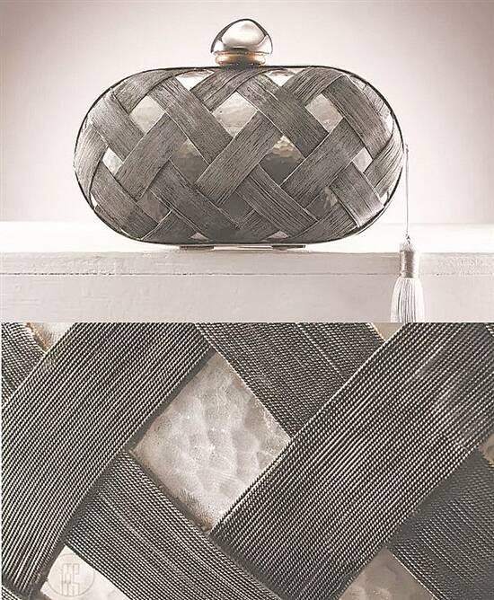 一些凸显传统工艺语言和材料特色、同时纳入现代的设计思路的作品让人更加印象深刻。例如一款名为《阡陌》的晚宴包(如左图),用贵州苗族的锻银工艺为主导,它结合了银饰、竹编、陶瓷、皮艺等多个材料、多个门类的传统工艺方式,但共同呈现出的却是一个非常现代用途的晚宴包。这里头最重要的工艺,一是银胎的锻打,一是银花丝工艺,共同创制出纵横交错形成现代几何图形的纹式,时代感强,跟上述传统技艺的手工制成品拉开了视觉和审美上的极大距离,所以能更好地融入当代的社会生活中。