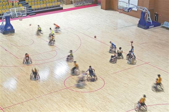 广州市残疾人体育运动中心内,轮椅篮球队正在训练