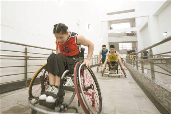 轮椅篮球队在训练馆的无障碍通道进行爬坡训练