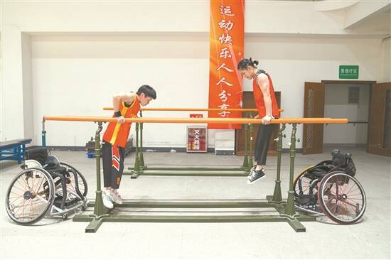 林穗玲(左)和左佩烯(右)在进行双杠臂屈伸训练