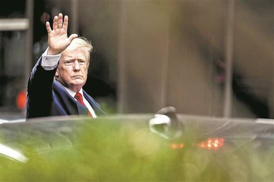 11日,美国前总统特朗普离开纽约特朗普大厦时向支持者挥手致意 图/人民视觉
