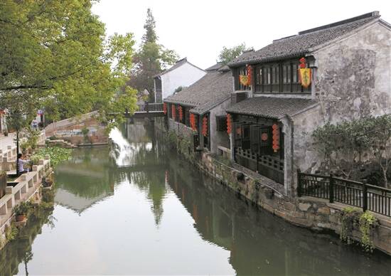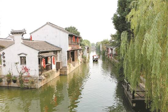 有河就有桥。桥有石拱桥、直桥、廊桥,也有单孔桥、多孔桥,各显风姿。桥像绳上一个个结,既把两岸扣在一起,又装点着古镇。有河的地方自然少不了船,小船或来往穿梭,或停在屋下。我登上一条乌篷船,艄公咿咿哑哑摇着橹,伴着哗哗的水声,用吴侬软语哼唱起当地的民歌。枕河的民居、驳岸的堤埠、红红的灯笼、一棵棵垂柳,打眼前一一呈现,摇晃着景致,伴着水的气息扑面而来。