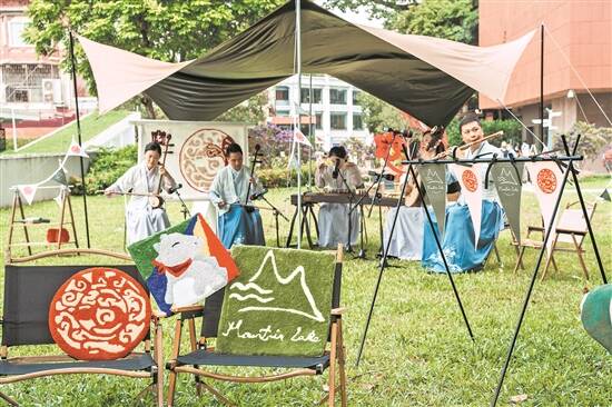 8月14日上午,“南博之夏·古风露营季”首个专题——“国风曲艺大赏”在王宫展区举行。该场活动邀请广东音乐曲艺团的乐师们为参与家庭演奏岭南曲艺。随着《雨打芭蕉》《彩云追月》《旱天雷》《步步高》等一首首耳熟能详的广东音乐名曲在博物院草坪上空回荡,20组亲子家庭开启了一场独特的研学露营活动。在户外露营场景烘托下,参与家庭在现场聆听悠扬雅致的曲韵,感受着古筝、中阮、笛子、椰胡、二胡等中国传统乐器的独特魅力。