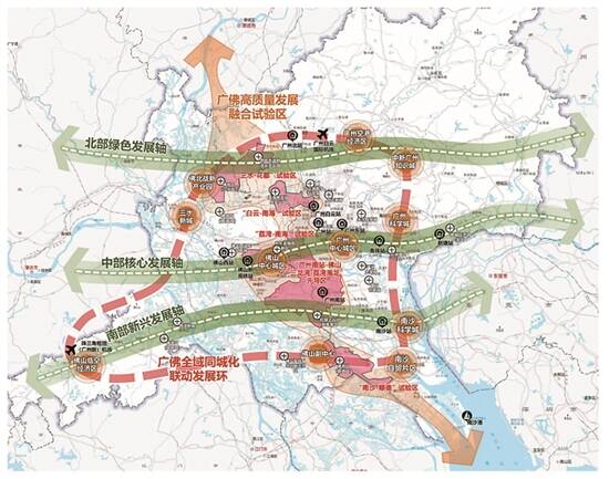 通过串联南沙港、南沙站、鱼珠站、广州白云国际机场、广州北站、珠三角枢纽(广州新)机场等重大交通枢纽和南沙自贸片区、广州科学城、中新广州知识城、广州空港经济区、佛北战新产业园、三水新城、佛山副中心等重大发展平台,构成枢纽和平台互为支撑、资源和要素无障碍流动的广佛全域同城化联动发展环。