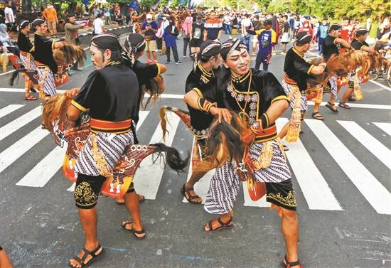 图为8月14日,在印度尼西亚中爪哇省三宝垄,舞者们表演“贾拉南”舞。“贾拉南”舞是一种印尼传统舞蹈,表演者骑着由竹子编制成的“马”跳舞。