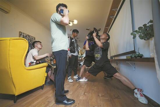 缺少群众演员,导演也会临场安排剧组工作人员出演。在片场会看到,“保安”在剪片、“工程师”拿着箱子在分发盒饭、“小卖部老板”在举着录音麦克风……虽然演戏不是大家的本职工作,但也乐在其中——角色,可以是戏里的,也可以是戏外的。