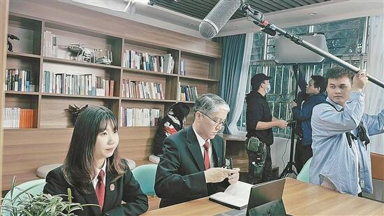 典型的微电影拍摄场景:深圳大鹏法庭里,法官和助理正在与专家视频对话