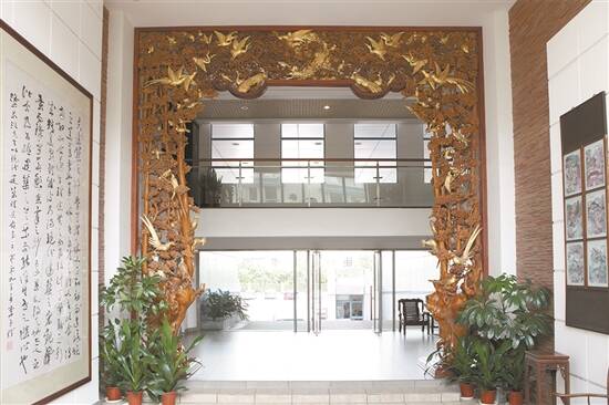 它以百鸟归巢云集聚足于四季如春的大家庭为主题,融铸传统的天人合一理念,于现代审美意识之中寓意人才济济,兴旺发达。此外,又选取两个百年以上的天然古老树桩,屹立两旁,以此象征基业永固,源远流长;再配以人工雕刻的榕树绿叶和百鸟图案,寓意枝繁叶茂,百鸟来聚,事业兴旺、富贵发达。上面横楣是潮州木雕多层次双面镂通。构图中集结了多种民间喜闻乐见而又寓意丰富的题材,如梅、兰、竹、菊,比喻不畏严寒,刚直不阿的清高品格和谦虚正直的君子之风。而牡丹凤凰则是幸福光明的象征。另外,还寄托有锦上添花、喜鹊登梅,百鸟朝凤等吉祥如意的旨趣。这样,其整体设计,既是传统文化的发扬,也是现代工艺美术的展示,都为方整宽这些敞的空间增光添彩。概言之,大型木雕作品《百鸟聚艺林》远看基调一致,近看栩栩如生,可以说是目前全国首例天然大树干和传统潮州木雕艺术与现代建筑相结合的典范作品。