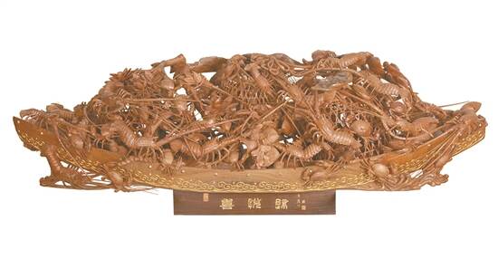 饶宗颐的评价李得浓“大匠无弃材”,既是对他精妙技艺的赞誉,也是他真实的生活写照。在李庆的记忆中,父亲热衷于搜罗各式各样的木头,为了找到适合雕塑的木材,屡次奔赴江西、湖南等地的深山。无需“寻尺”,李得浓往往看上一眼,便可“各有施”。他认为被人所遗弃的边角料、奇形怪状的木材往往是一个宝库,具有不可替代的价值。木雕作品《游目骋怀》就是一个典型例子:取材于凹凸不平的瘤杉根部。李得浓将一只木雕蟹篓置于其中,篓外篓内七只龙虾生猛活泼、游态各异,十四只大鳌高扬的螃蟹在浪花和小草之中游弋,根瘤的斑点宛如浪花溅起的水珠。