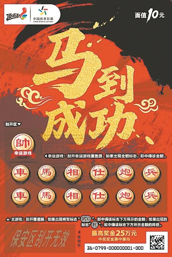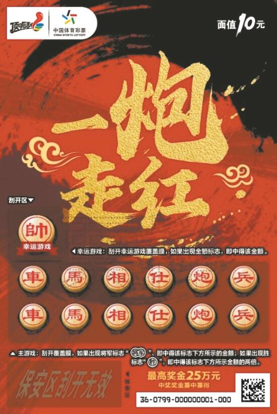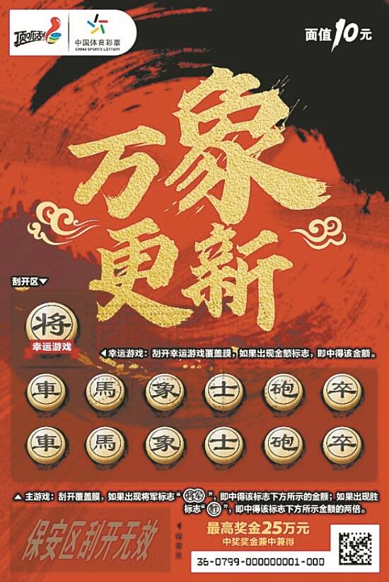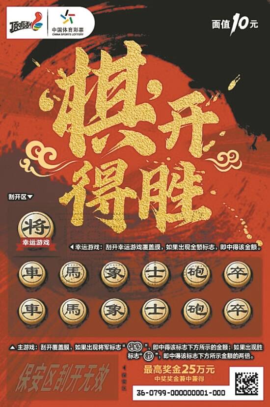 据了解, “棋王”面值10元,共有13次中奖机会,最高奖金25万元。游戏玩法为找奖金符号+找中奖符号。具体游戏规则为,幸运游戏:刮开幸运游戏覆盖膜,如果出现金额标志,即中得该金额。主游戏:刮开覆盖膜,如果出现将军标志“(插入将军图)”,即中得该标志下方所示的金额,如果出现胜标志“插入胜图”,即中得该标志下方所示金额的两倍,中奖奖金兼中兼得。