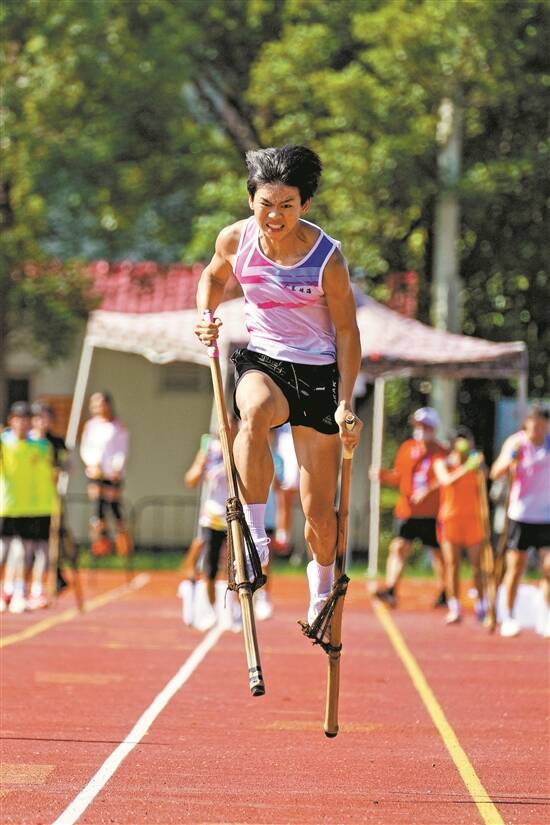 运动会首日,高脚竞速男子组小组赛 羊城晚报记者 林清石 摄