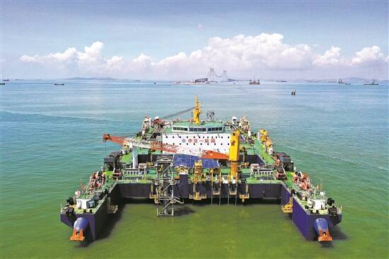 沉管浮运安装一体船提带E20管节到达沉放水域,开展沉放安装作业