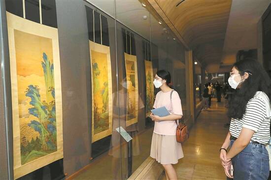 40余件套明清时期青绿山水画让观众大饱眼福,通过展出的实物和专家创作的分步骤示范画稿,观众还可初步了解青绿山水画的创作过程 黄伟哲 摄
