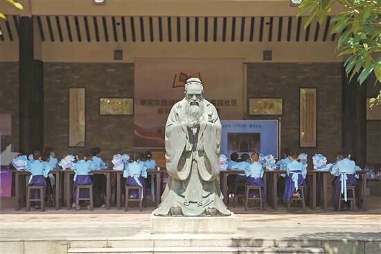 孔子像下,琅琅读书声,孜孜勤学影。8月23日,肇庆市鼎湖区蕉园村龙溪书院,一场别开生面的“国学礼”活动举行。