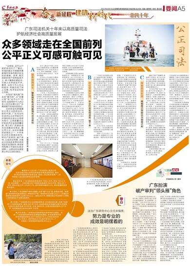 时至今日,在优化营商环境最看重的“办理破产”指标方面,广东又处于全国领跑地位:2016年8月,全国首个高级法院层面破产审判庭落户广东;2019年1月、12月,深圳、广州相继在全国最早一批成立专门破产法庭;2021年3月1日,《深圳经济特区个人破产条例》实施,先后产生我国境内首宗个人破产重整、个人破产和解和个人破产清算案例;2021年5月,最高人民法院明确深圳法院作为第一批跨境破产协作试点法院,为内地与香港法院开展跨境司法协助提供样本;广州法院“办理破产”指标排名全国第一,深圳破产制度综合改革获得最高人民法院首届“人民法院改革创新奖”。