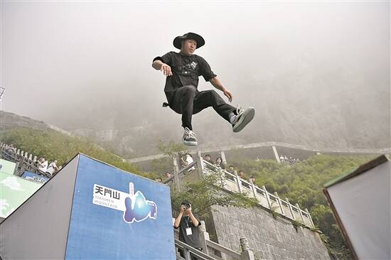 就在今年7月,湖南张家界天门山景区举办了一场“云纵天梯”跑酷大赛,将天门山的999级“天梯”设计成了跑酷赛道。这是跑酷爱好者们公认的国内规模最大、赛道最长、技术难度最大、场地环境最为独特的跑酷大赛,这场赛事便将跑酷动作的连贯、难度、流程、完成质量四个方面作为技巧赛和大招赛的考核指标。参赛选手们的空翻、落地翻滚、侧手反抓墙、反抓栏杆等技巧,在天门山“天梯”这一落差极大的赛道上展示起来就像古代的轻功高手一般,令人由衷喝彩。