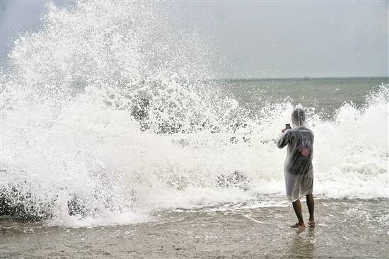 25日,茂名电白童子湾景区,市民观看风浪 羊城晚报记者 汤铭明 曾育文 摄