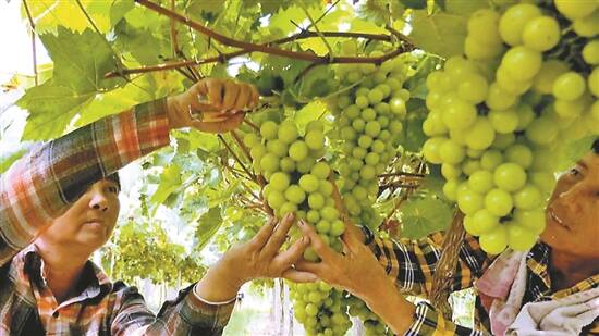 走进顺天生态葡萄园,一串串颗粒饱满、色泽诱人的葡萄挂满枝头,散发出阵阵醉人芳香,引人垂涎。果农们、游客们往来穿梭采摘,一派丰收景象。“这里的葡萄又大又圆又甜,我们带孩子来采摘,玩得很开心。”游客高兴地说。