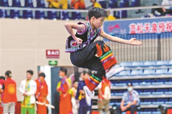 9岁的阿妹身披瑶族传统服饰,在赛场上做了一个经典的传统武术造型——提膝亮掌,技惊四座。她展示的拳种叫查拳。