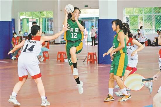 珍珠球比赛中,清远队进攻强势,广师大队全力阻止对方得分