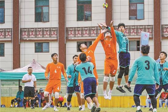 被誉为“中国式橄榄球”的花炮赛场上,比赛双方正在激烈地争抢。抢、跑、拦截、传递等各种技术动作,要求运动员有极强的身体素质和团队协作能力。